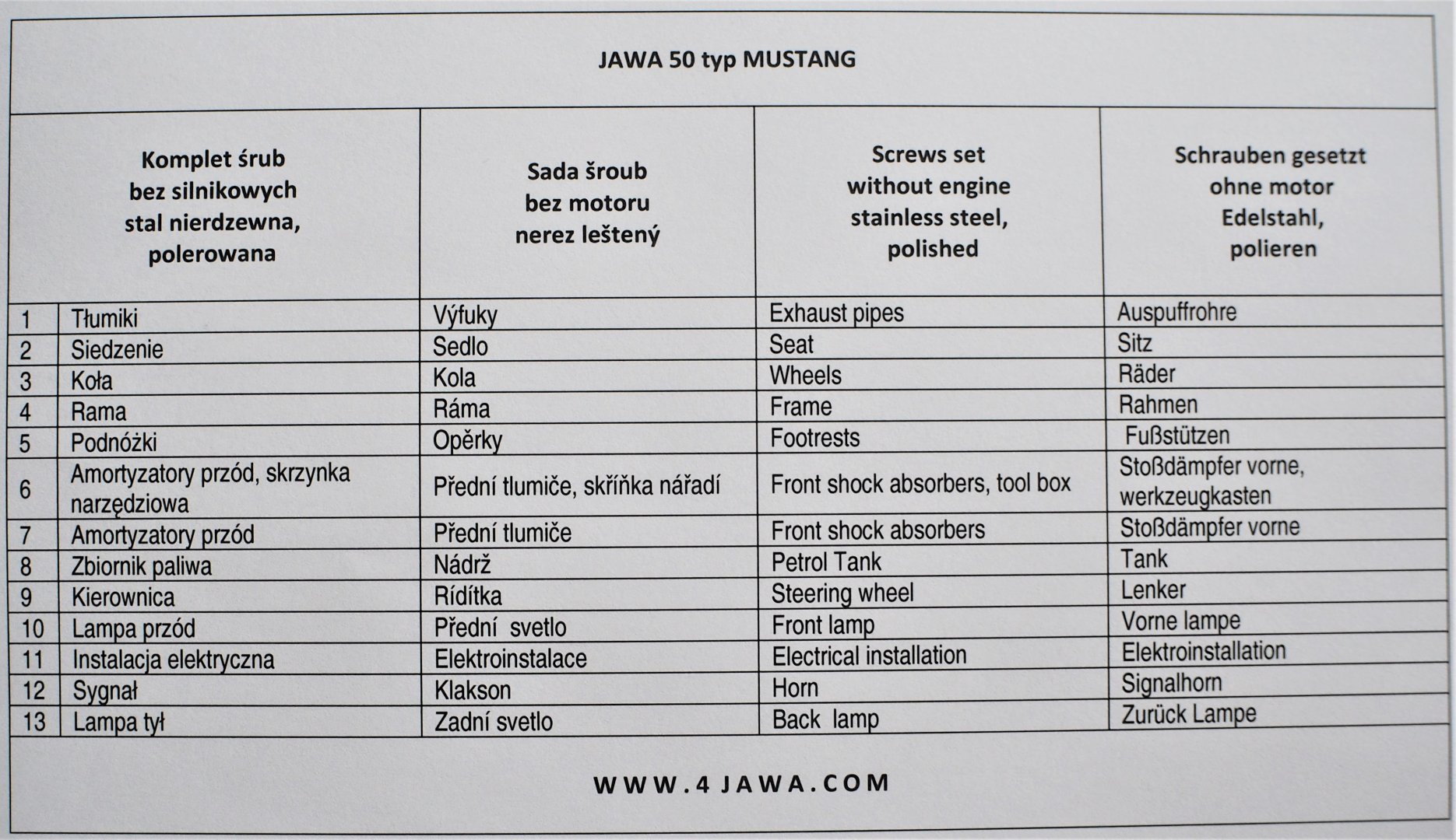 Komplet śrub, bez silnikowych, nierdzewne/polerowane, Jawa 50 typ 23 Mustang