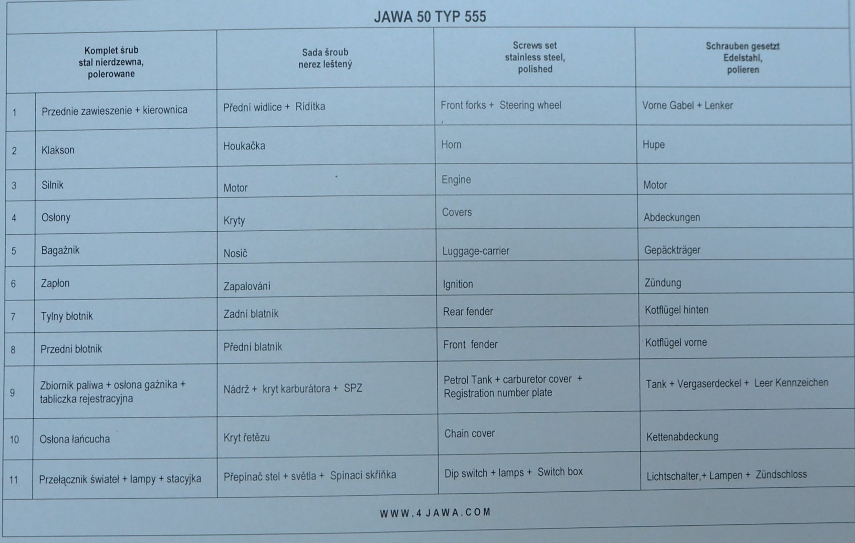 Komplet śrub, karoseria + silnik, nierdzewne/polerowane, Jawa 50 typ 555